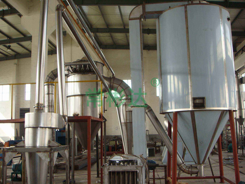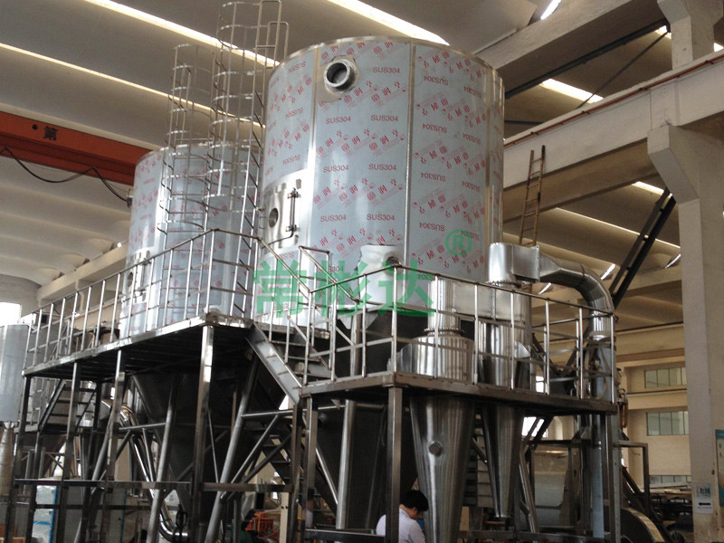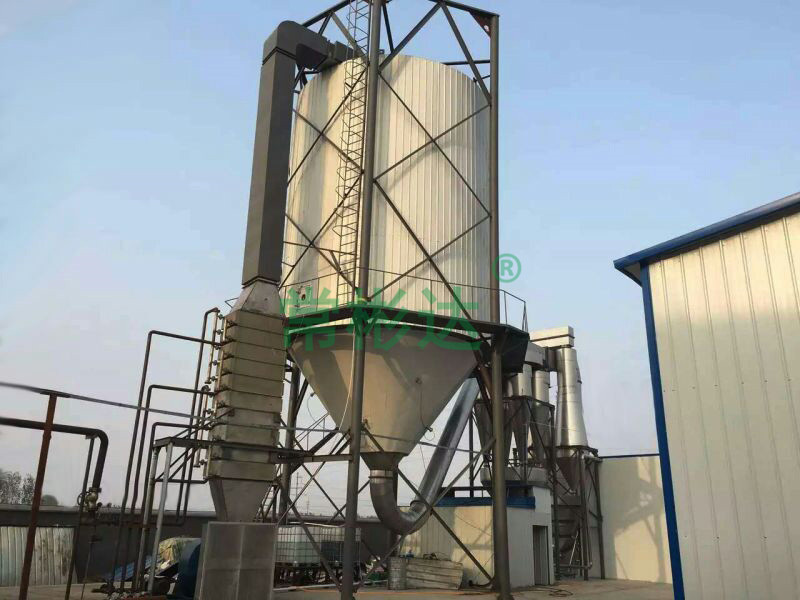 空氣經過濾和加熱,進入干燥器頂部空氣分配器,熱空氣呈螺旋狀均勻地進入干燥室。料液經塔體頂部的高速離心霧化器,(旋轉)噴霧成極細微的霧狀液珠,與熱空氣并流接觸在極短的時間內可干燥為成品。成品連續地由干燥塔底部和旋風分離器中輸出,廢氣由風機排空。